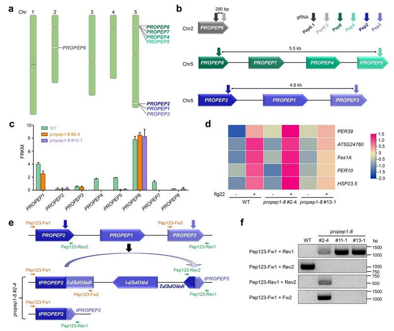 图1. 模式植物拟南芥中串联同源基因的CRISPR敲除诱发意外的敲除/倒置双等位突变体。a, 拟南芥的PROPEP基因家族是代表性的串联同源基因。b, CRISPR敲除PROPEP1-8所用的成对gRNA靶向示意图。c, PROPEP1在传统三引物法PCR鉴定的“敲除”突变体propep1-8 #2-4植株中仍存在表达。d, PROPEP1应答的抗病基因在“敲除”突变体propep1-8 #2-4中仍有正常应答。e,f, 新的PCR鉴定策略揭示propep1-8 #2-4突变体是敲除/倒置双等位突变体。