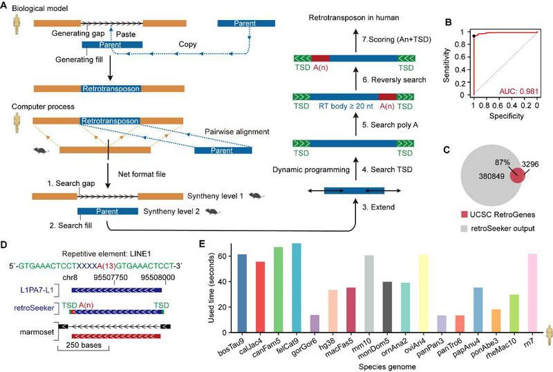 近日,bat365在线中国登录入口生命科学学院杨建华/屈良鹄教授团队开发了在全基因组检测逆转录转座子的新计算方法retroSeeker。通过将逆转录转座子事件的生物学模型(复制-粘贴)映射到比较基因组学数据(gap和fill)中,retroSeeker算法能够准确地识别任何物种基因组中的新逆转录转座子。具体而言,亲本基因的存在产生了一个“填充”(fill)区域,而“复制-粘贴”过程则在新的基因座产生了一个“间隙”(gap)区域,通过将物种间的基因组进行两两比对,可以复现这些“填充”和“间隙”区域以获得候选的转座子区域 (图1A)。此外,根据逆转录转座的TPRT(target-site primed reverse transcription)机制,逆转录转座子的复制往往还需要借助其poly(A) 尾巴,且在插入新基因座后,逆转录转座子两侧还会形成标志性的TSD(target site duplications)序列。因此,一旦retroSeeker确定了潜在的逆转录区域,它会立即利用动态规划算法对侧翼的TSD和poly(A)序列进行搜索和评分,最终获得高置信度的逆转录转座子候选 (图1A)。通过模拟数据和真实数据的测试,retroSeeker算法表现出高度特异性、高灵敏度和快速的运行速度。(图1B-E)。