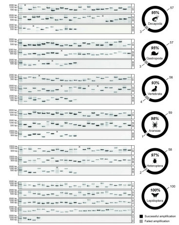 图2. 六个后生动物类群(十足目、腹足纲、脊椎动物亚门、蜘蛛目、异翅亚目、鳞翅目)引物集的PCR扩增试验结果