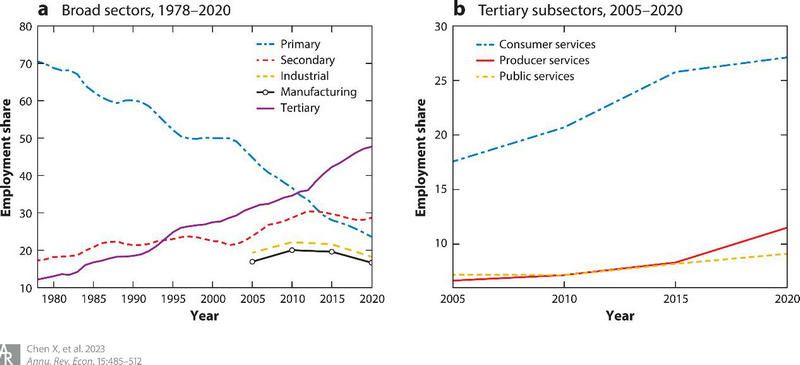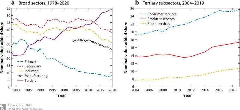 基于此,本文对我国持续增长的服务业进行了系统的考察。首先,本文利用中国统计局的分行业数据表明,为工业部门提供投入的服务业(即生产性服务业)正快速增长。然而,生产性服务业并非服务业快速发展的唯一驱动力。消费性服务业,也即改善消费者获取商品机会(例如零售或餐馆)或提供家庭直接消费服务(例如娱乐、健康、社区服务)的行业也有显著的发展。本文还发现生产性服务业和消费性服务业的生产率有显著增长,化解了对中国经济中服务业生产率停滞不前的担忧。