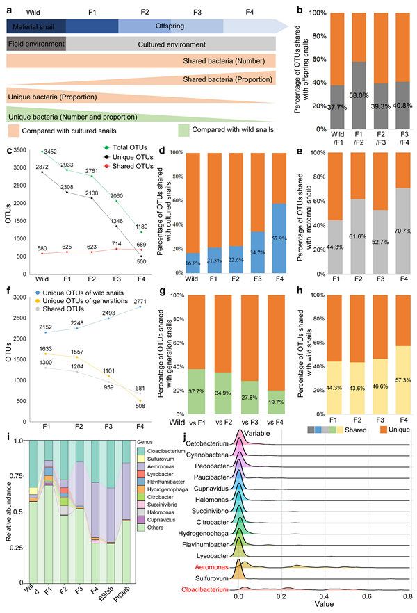 该研究揭示了以下重要发现:(a) 野生和饲养的腹足纲动物的肠道微生物群落存在显著差异,不同的腹足纲动物种类都存在肠道核心微生物Aeromonas、Cloacibacterium和Cetobacterium;(b) 在腹足纲动物中,尽管水平传递占据了大部分肠道菌群的传播比例,但约43%的肠道微生物可以在非无菌环境中通过垂直传递的方式遗传给下一代;(c) 在非无菌条件下,野生腹足纲动物的肠道微生物可以维持长达2代,之后F3和F4代的肠道菌群的组成会逐渐与饲养的腹足纲动物肠道菌群趋同;(d) 肠道菌群的趋同进化可能有助于腹足纲动物从野生环境到养殖环境的适应性进化,并且这一过程与代谢功能相关;(e) 垂直传递而不是水平传递推动了肠道菌群的趋同进化,促进宿主健康。这表明肠道微生物群落结构的变化可以作为宿主健康水平或当前状态的潜在指标;(f) 发现核心微生物Aeromonas和Cloacibacterium不仅能够跨多子代垂直传递,还可在宿主不同发育阶段中纵向传播,为肠道定植菌。