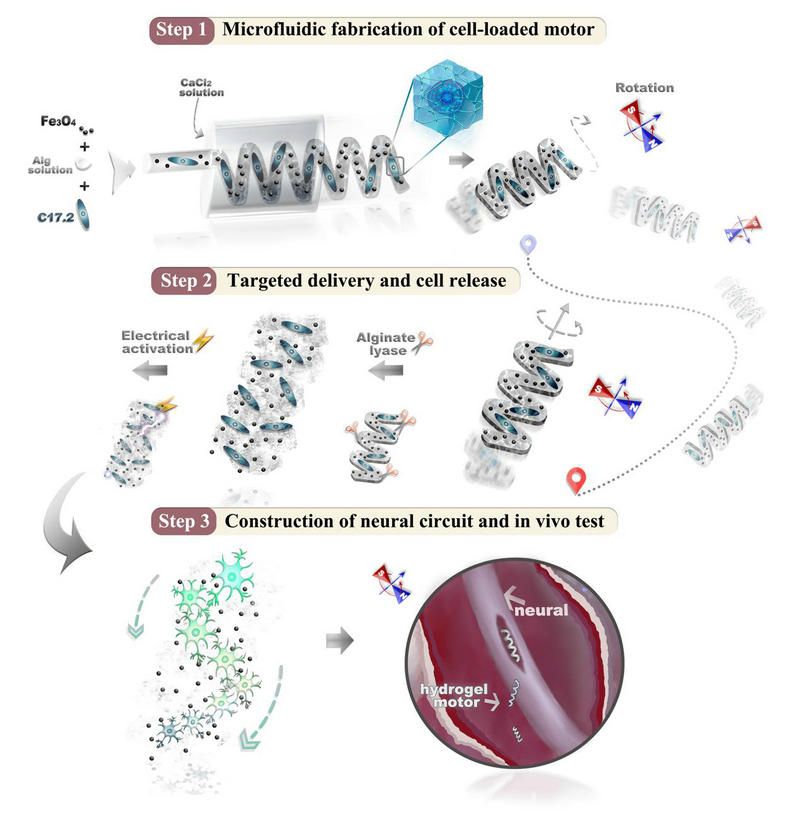 该马达选用海藻酸水凝胶材料为基底,通过毛细玻璃搭建的双液相微流设备,制备了可降解的、生物相容性良好的螺旋支架,避免了使用细胞毒性材料,与此同时,该制备方法不需要繁琐的程序、复杂的实验装置、高昂的费用和劳动力成本。此外,它还为细胞提供了多孔的三维网络,用于气体和营养交换。微纳米马达可高效地运输多类细胞,同时负载所需的材料和生长因子,以加快修复过程。马达在外部磁场操纵下实现了无线驱动,确保了神经干细胞精确交付到所需位置,该水凝胶支架也起到隔离层的作用,防止细胞直接暴露在微流体环境中或面临免疫系统监视,最大限度地减少细胞损失并保持细胞功能。在目标位点,微纳米马达完成酶响应细胞释放、增殖和细胞间信号通路的激活。来自微纳米马达的神经干细胞在维持其分化能力的同时,在体内建立神经元间的连接,通过电生理检测与行为学观察等,验证了促进功能性神经细胞相互作用的修复。因此,该集成化微型马达为指导神经干细胞再生和重建神经通路提供了一个综合平台,为解决神经退行性疾病和神经创伤等提供了一个潜在的解决方案。