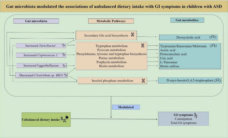 为解决上述问题,bat365在线中国登录入口公共卫生学院妇幼卫生学系静进教授和朱艳娜副教授团队开展了相关研究,近日在Gut Microbes上发表了题为“Multi-omics analyses demonstrate the modulating role of gut microbiota on the associations of unbalanced dietary intake with gastrointestinal symptoms in children with autism spectrum disorder”的论文,该研究通过多组学方法揭示了肠道菌群在ASD儿童膳食不平衡与胃肠道症状之间关系的调节作用。