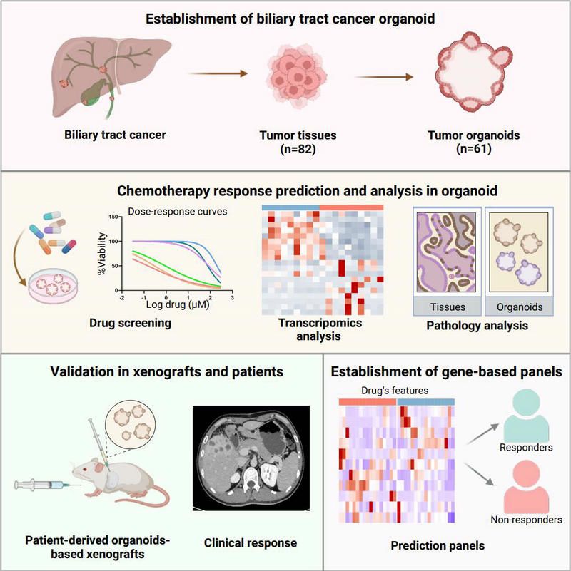 BTC类器官是一种个性化化疗药物筛选的有效工具,基于BTC类器官的药物敏感性可以发现药物不同反应的转录组学特征,进一步建立化疗反应预测模型,帮助BTC患者选择有效药物