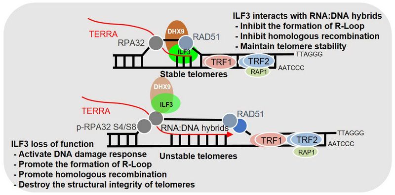 2023年11月22日,bat365在线中国登录入口生命科学学院松阳洲课题组在Protein and Cell在线发表了题为“ILF3 safeguards telomeres from aberrant homologous recombination as a telomeric R-loop reader”的研究论文。本研究利用端粒体蛋白的双分子荧光互补(bi-molecular fluorescence complementation,BiFC)技术,结合RNA: DNA互作蛋白的质谱数据,筛选鉴定出ILF3是一个新的端粒R-loop结合蛋白。通过微量热泳动、免疫共沉淀、免疫荧光等实验,证明了ILF3作为端粒 R-loop Reader,以RNA依赖的方式定位在端粒上。此外,利用课题组自主开发的新型快速生物素邻近标记技术PhastID(已获国家发明专利授权),鉴定出ILF3与DHX9相互作用并阻止了TERRA进一步侵入到端粒双链DNA中,从而抑制过多的R-loop的形成。ILF3功能缺失增加了TERRA的转录,导致R-loop在端粒上积聚,增加了端粒损伤TIFs的水平。端粒脆性和染色体外端粒重复序列的增加,引起DNA损伤反应和端粒结构的异常,激活了同源重组介导的ALT通路,并最终导致了端粒的异常延伸。