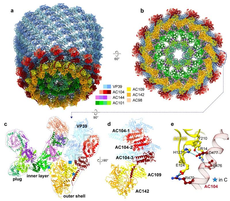 图a,b从不同角度展示了杆状病毒AcMNPV尾部整体的原子模型。图c展示了尾部的一个最小组成单元。图d和e详细展示了蛋白与蛋白之间的具体相互作用。