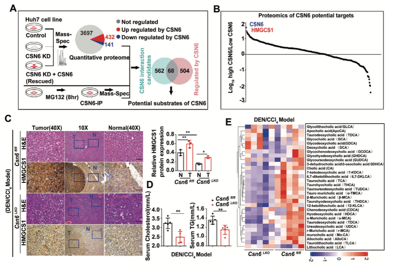 研究团队采用大数据进行联合肝癌组织微阵列免疫组化分析,发现CSN6在肿瘤组织中表达上调且与病人生存率低显著相关。进一步,采用CRISPR-Cas9基因编辑系统构建肝脏特异性CSN6基因敲除小鼠,通过构建原位肝癌自发模型,研究团队发现肝脏特异性敲除CSN6可抑制肝脏肿瘤生长,并降低小鼠血液胆固醇水平,这提示CSN6在肝癌发生发展中发挥重要作用。