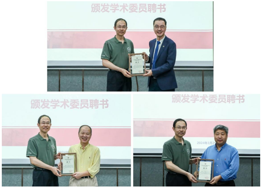 会上,郑跃副校长和学术委员会主任汪卫华院士分别为学术委员颁发了聘书。
