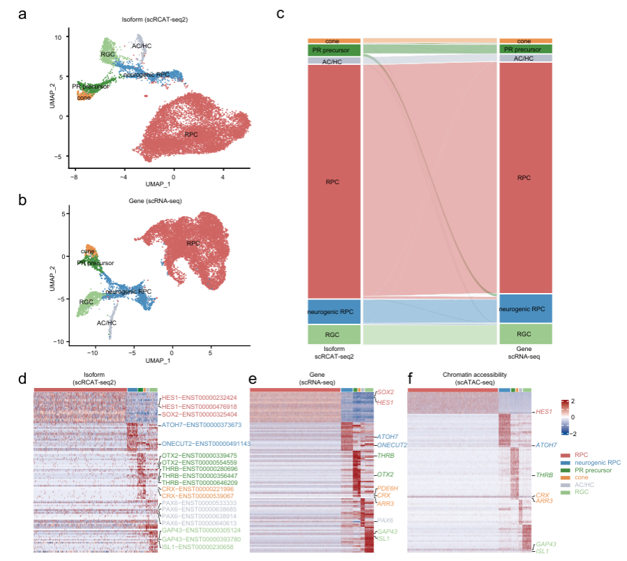 研究者将scRICA-seq应用于人类视网膜发育过程,构建了人类视网膜类器官的单细胞多组学图谱。基于单细胞异构体的聚类分析,确定了六个细胞簇,对应于六种典型的视网膜早期神经元,包括视网膜祖细胞(RPCs)、视网膜神经节细胞(RGCs)、无长突细胞/水平细胞(AC/HCs)、视锥细胞前体(PR precursors)、神经生成RPCs(neurogenic RPCs)以及视锥细胞(cones),其结果与scRNA-seq技术所得数据高度一致。(图3)