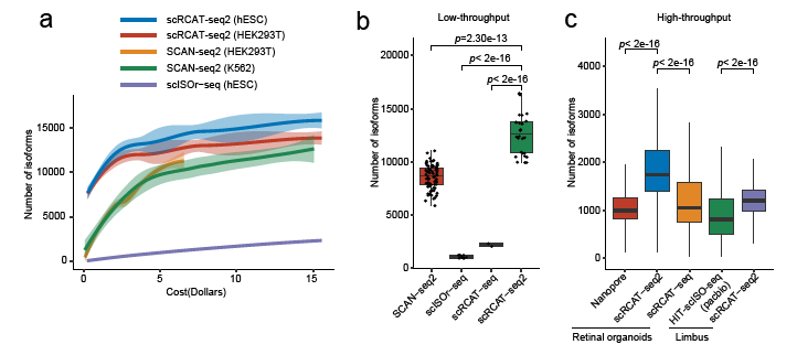 研究者将scRCAT-seq2在低通量与高通量条件下与多种三代测序技术(如SCAN-seq2、scISOr-seq、HIT-scISO-seq等)进行对比分析,结果显示scRCAT-seq2在成本效益和检测灵敏度方面均具有显著优势。(图2)