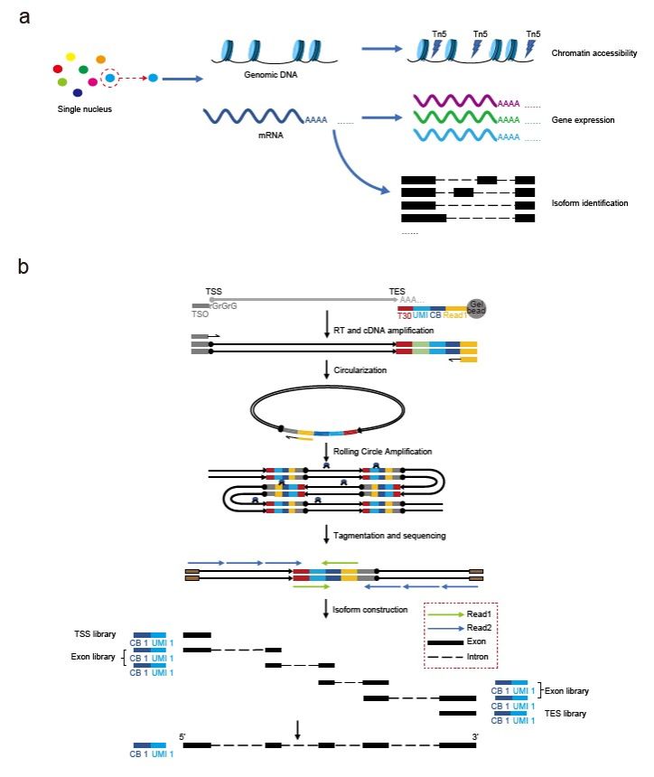 胡友金团队长期专注于单细胞测序技术的创新开发。早在2020年,该团队已在《Nature Communications》上发表scRCAT-seq技术,用于RNA isoform的检测。此次,团队进一步改进原有方法,发展了scRCAT-seq2全长转录组测序技术,并结合10x Genomics的Chromium Next GEM Single Cell Multiome ATAC + Gene Expression平台,实现了染色质可及性与RNA isoform同时检测的多组学方法。其中,scRCAT-seq2的核心技术是通过单分子成环技术处理cDNA,并将覆盖TSS,TES和exon的测序序列进行同一标签标记,并组装构建全长cDNA序列。(图1)