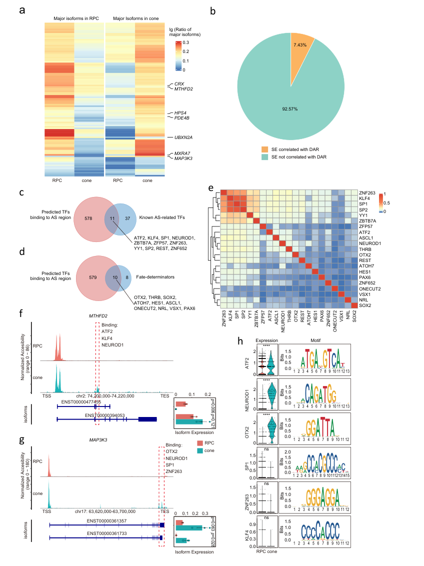 图4:RPC发育过程中RNA isoform选择与染色质可及性和TFs的相关性