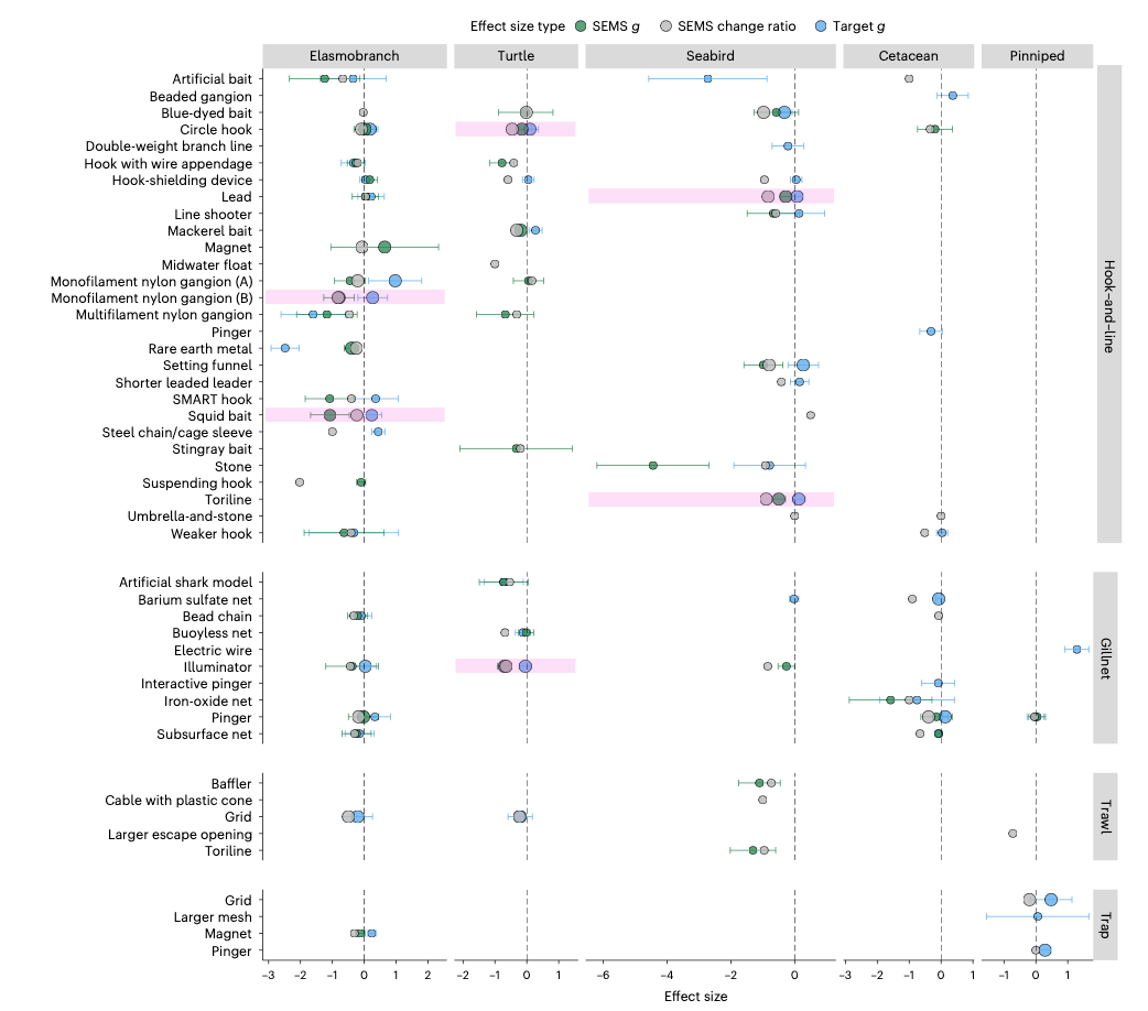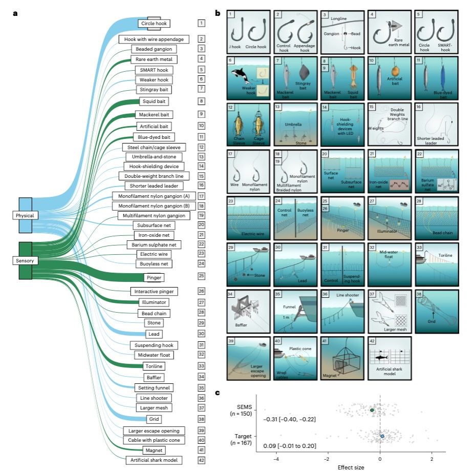 本研究针对减少脆弱海洋动物误捕的技术性措施,基于公开实验研究,构建了全球性数据集,采用荟萃分析方法,系统性量化评估了42种措施(图1a.b)对目标渔获和脆弱海洋动物误捕的影响。