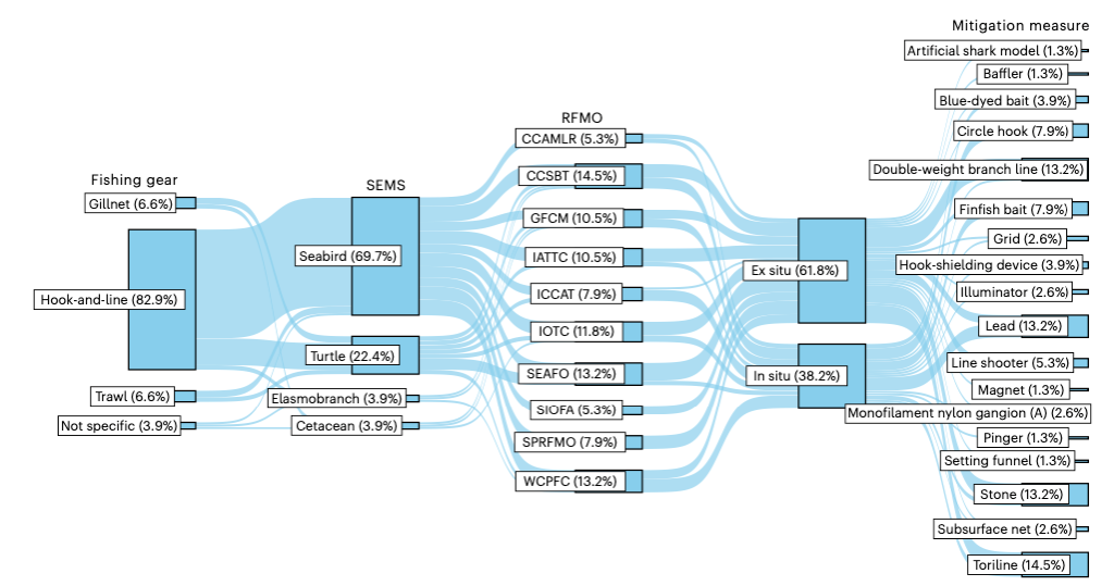减少渔业对脆弱海洋动物的误捕有助于实现多个昆明-蒙特利尔全球生物多样性框架目标(如目标4)和可持发展目标(如水下生命,Life Under Water)。本研究基于大量实验研究,首次在全球尺度评估了现有技术性措施的成效及其被区域性渔业管理组织的采纳情况。同时,本研究认为其他措施也十分重要,如捕捞操作性措施、应急处理放归措施、渔业贸易禁令和管控条例。在实践中,这些措施可以集成在“预防-减少-修复-补偿”的大框架下,产生协同的效应。