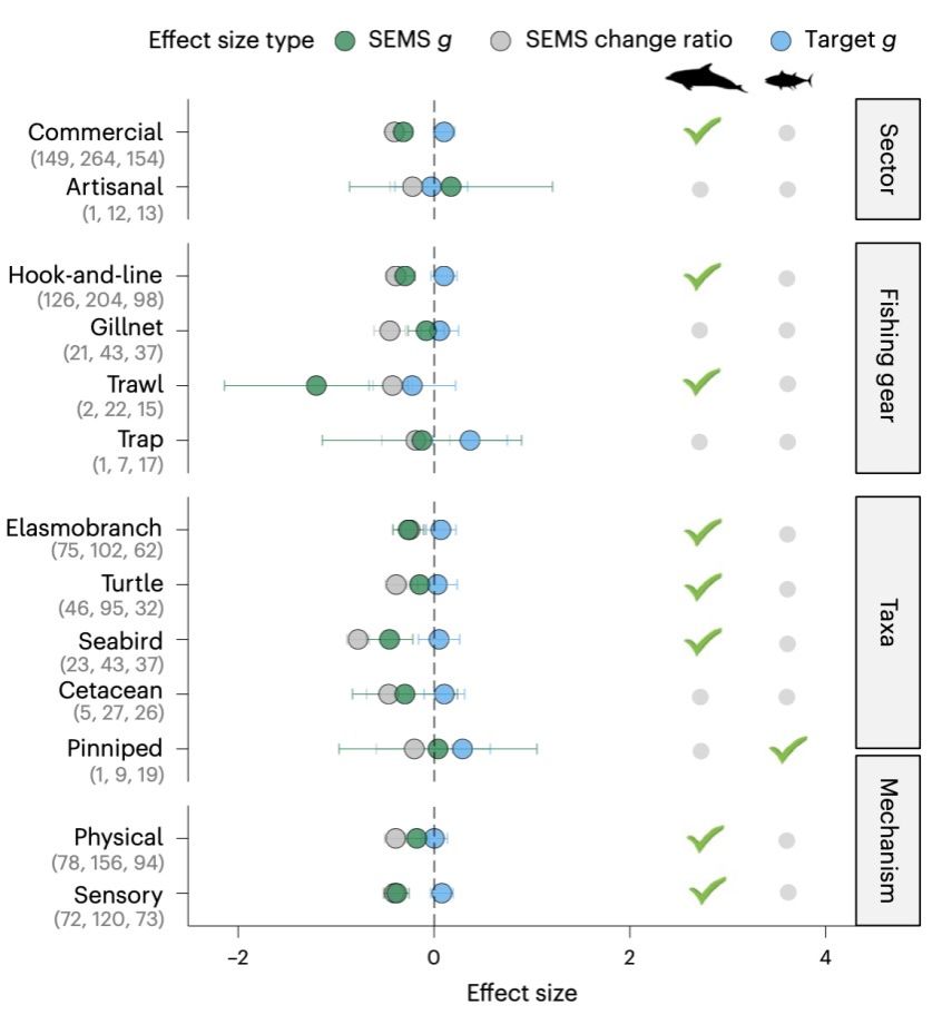 近日,由bat365在线中国登录入口生态学院和水产动物疫病防控与健康养殖全国重点实验室领衔的国际团队在环境科学与生态学领域顶级期刊Nature Sustainability发表题为“Effects of fishery bycatch-mitigation measures on vulnerable marine fauna and target catch”的研究论文。该研究在全球尺度,系统性量化评估了减少误捕的技术性措施对渔业的目标渔获以及脆弱海洋动物的影响。该研究发现:总体来看,这些技术性措施可显著减少捕捞作业对脆弱海洋动物的误捕事件,同时对目标渔获无显著影响。