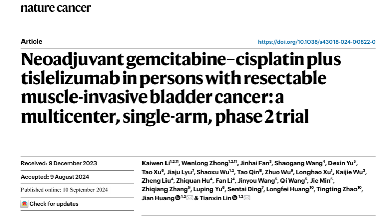 近日,bat365在线中国登录入口孙逸仙纪念医院林天歆教授和黄健教授领衔的国内多中心临床研究(BGB-A317-2002)探讨了替雷利珠单抗联合吉西他滨/顺铂新辅助治疗中国MIBC患者的疗效、安全性及潜在的预测性生物标志物。这项研究为中国MIBC患者的治疗提供了重要的循证医学支持,并于2024年9月10日,在国际顶级期刊《Nature Cancer》上,发表了题为《Neoadjuvant gemcitabine–cisplatin plus tislelizumab in persons with resectable muscle-invasive bladder cancer: a multicenter, single-arm, phase 2 trial”》的论文。该论文的通讯作者为林天歆、黄健教授,李锴文副主任医师和钟文龙主治医师为共同第一作者。