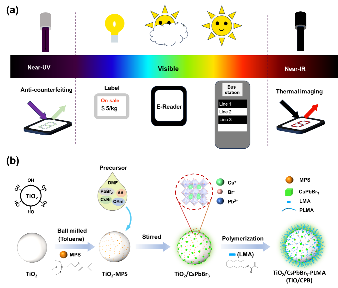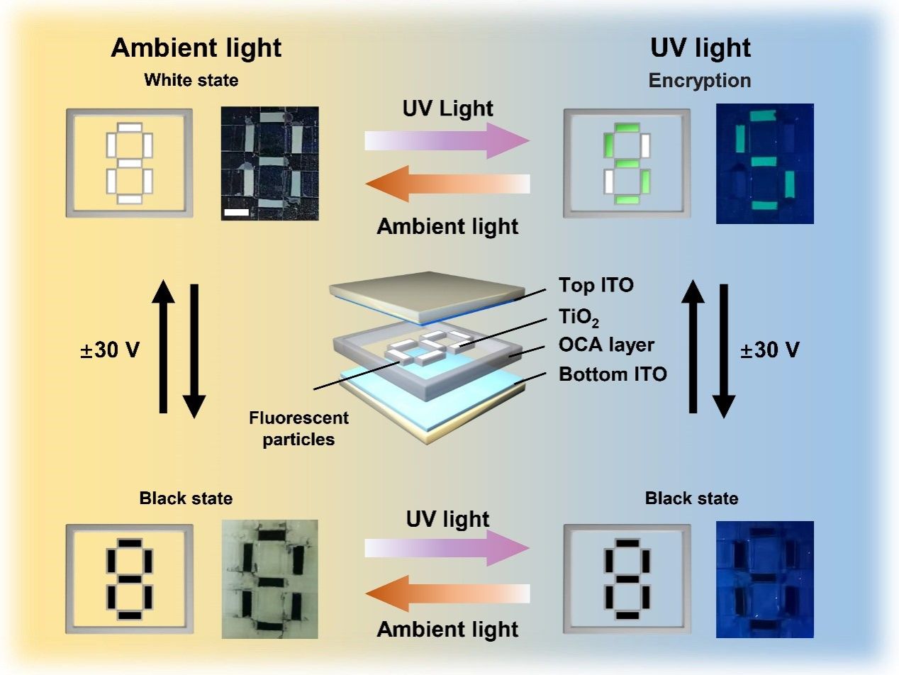 中大新闻网讯(通讯员林锐娜)传统的光学防伪技术大多依赖于静态印刷图像,安全性较低,因此需要开发具有动态调制图案功能的新型防伪设备。近日,bat365在线中国登录入口杨柏儒教授团队开发出了一种新型荧光电泳显示(EPD)技术。该团队通过在传统的电泳粒子TiO₂上复合钙钛矿量子点(CsPbBr₃),制备了具备荧光特性的电泳粒子,并进一步研制了一种多功能防伪器件。该器件不仅响应快速、对比度高,而且能够呈现明亮的绿色荧光,为未来的动态防伪和识别提供了新思路。这项研究成果以题为“Fluorescent, multifunctional anti-counterfeiting, fast response electrophoretic display based on TiO2/CsPbBr3 composite particles”发表在《Light: Science & Applications》期刊上,杨柏儒教授为通讯作者,博士生刘广友为第一作者。此项研究得到了国家重点研发计划、科技部项目、广东省重点地区研发计划等项目的支持。