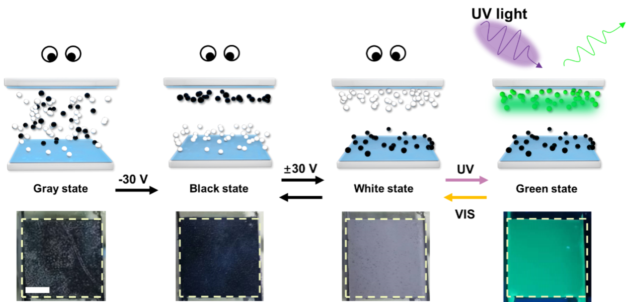 图3.荧光EPD在白、绿、黑三种状态下的原理图和照片。比例尺:1厘米