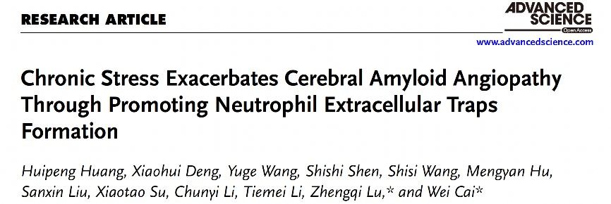 中大新闻网讯(通讯员 黄惠蓬)近日,bat365在线中国登录入口附属第三医院脑病中心陆正齐教授/蔡蔚副研究员团队于Advanced Science(中科院一区)在线发表长文“Chronic Stress Exacerbates Cerebral Amyloid Angiopathy through Promoting Neutrophil Extracellular Traps formation”,报道焦虑情绪加剧中性粒细胞发生NETosis并促进CAA的病情进展,开拓了负性情绪加剧的神经炎症在脑小血管病发病机制中的研究思路。