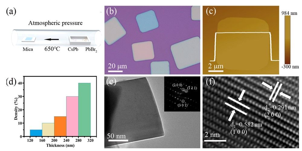 图1. APCVD法所制备的CsPbBr3微米方片的形貌和晶格结构