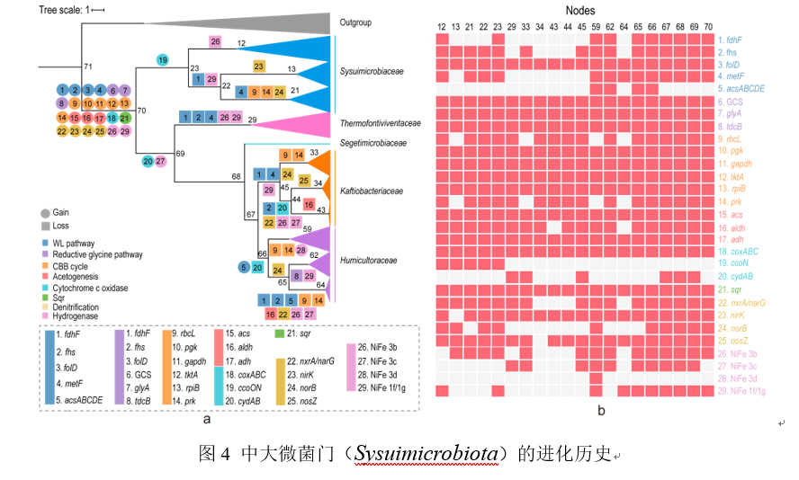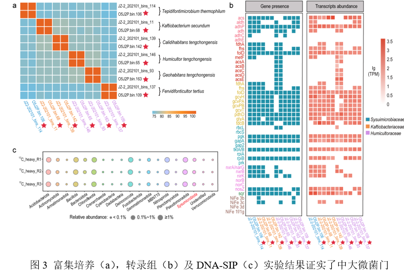 本研究从热泉原始样品的宏基因组数据中重构了CSP1-3类群的基因组,结合NCBI数据库中的基因组,最终选取112条完整度大于80%,污染度小于5%的CSP1-3类群基因组进行分析。系统发育结果显示,这112条基因组所代表的菌株属于同一门,可划分为5个不同的科,11个属和25个种(图1)。这些基因组所代表的菌株广泛分布于世界各地,土壤和热泉是适合该类群生存的生境(图1)。基因组分析结果显示,该门类群的菌株是兼性厌氧微生物,能通过还原性甘氨酸途径(RGP)、卡尔文循环(CBB)和伍德-永达尔通路(WLP)进行碳固定实现自养生长,氢化酶的存在及硫化物的氧化是自养生长过程中主要的能量来源(图2)。采用自养培养基在厌氧条件下对CSP1-3类群进行富集,荧光原位杂交(FISH)实验及扩增子结果显示,CSP1-3类群被成功富集且丰度有明显的提高。同时,宏转录组及稳定同位素核酸探针(DNA-SIP)技术分析结果进一步证实了CSP1-3类群的化能自养功能(图3)。进化分析表明,CSP1-3类群的祖先能通过RGP进行自养生长并产生乙酸,且该功能在该门类群之间进行垂直传递,而CBB、WLP和反硝化功能则是通过不同的水平基因转移事件获得(图4)。最终,本研究将该门类群命名为中大微菌门(Sysuimicrobiota phy. nov.)。该研究通过多组学技术和富集培养手段,系统深入地探究了中大微菌门的多样性,空间分布格局,参与的生态功能角色和进化历史,拓展了对未培养细菌的认知,完善了热泉微生物生态功能过程理论,也为极端环境微生物新资源的挖掘提供了一种可能的思路和策略。