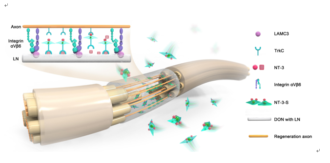 检测PNT的结果表明,其中的DON纵向通道管壁独特的生物活性基质成分LAMC3或LN,能够通过与基因工程雪旺细胞(NT-3-SCs)分泌的NT-3结合,形成一种富集NT-3沉积区域。位于PNT的NT-3-SCs亦可以通过其细胞表面的NT-3受体TrkC结合自分泌的NT-3: 一方面促使NT-3-SCs能够更好地定植在沉积NT-3的区域内,形成一种PNT的动态生物活性龛位; 另一方面NT-3与TrkC(配体与受体)的互作进一步激活NT-3-SCs更好地存活并分泌多种神经营养因子,形成诱导神经元轴突集束再生长的微环境和结构基础。