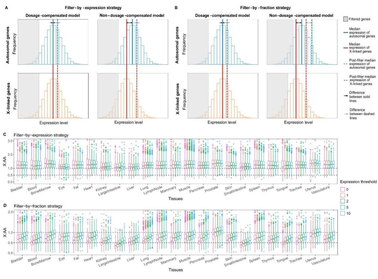 研究人员首先使用模拟scRNA-seq和bulk RNA-seq数据集评估了两种常见的X:AA基因选择策略,即按基因表达水平过滤和按基因表达比例过滤。他们发现这两种策略都会产生夸大的X:AA表达比率,从而人为地支持剂量补偿模型。