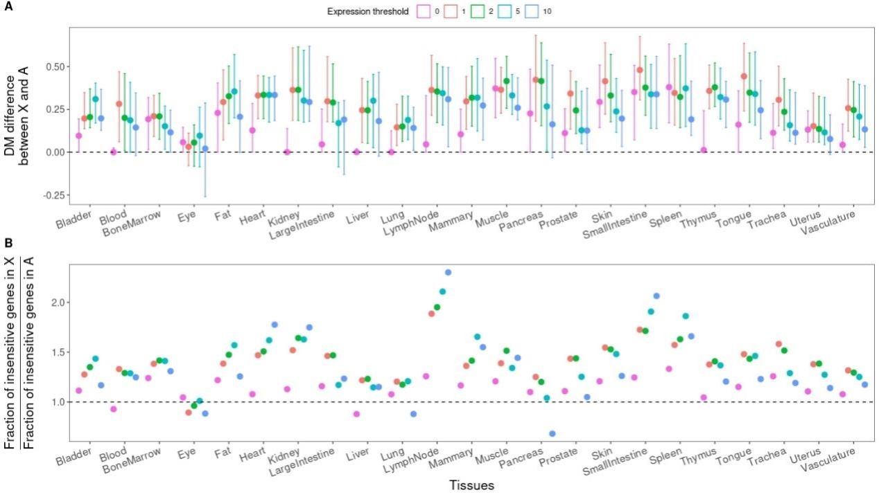 此外,尽管平均表达水平存在偏差,但研究人员发现scRNA-seq数据可用于检测小至10%的X染色体与常染色体的表达噪声的差异,从而能够研究对基因剂量变化更不敏感的基因分布。对Smart-seq2数据的分析显示,与常染色体相比,X染色体的表达噪声增加了10-15%,X染色体上剂量敏感基因显著减少。
