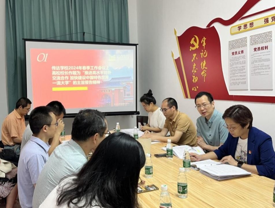 曾佳妮副书记传达了陈春声书记在2024年春季工作会议上的总结讲话精神。她指出,陈春声书记强调要充分发挥党组织领导作用,把党的领导贯穿到高水平对外交流合作的全方位和全过程,一是深入贯彻落实党的二十大精神,准确理解把握教育强国建设的战略布局和高水平对外交流合作的意义;二是坚持和加强党的领导,服务高质量发展,推动高水平对外交流合作取得新成效;三是坚持总体国家安全观,有效防范化解风险,为推动高水平对外交流合作提供坚强政治保证。曾佳妮副书记还传达了校党委副书记、纪委书记、国家监委驻bat365在线中国登录入口监察专员刁振强警示教育专题报告精神,并开展纪律教育、师德师风教育、保密教育,以及师德警示教育。曾佳妮副书记强调,要深刻领悟习近平总书记的重要讲话精神和全国两会精神,以习近平外交思想为引领,深入学习领会学校春季工作会议精神,坚持和加强党的全面领导,确保党对教育对外开放的决策部署得到有力贯彻执行,确保学校高水平对外交流合作的战略措施得到有力落实;要高标准高质量开展党纪学习教育,切实把学习成果体现为推动事业发展的实际成效,为助力学校事业实现高质量内涵式发展作出新的更大贡献。