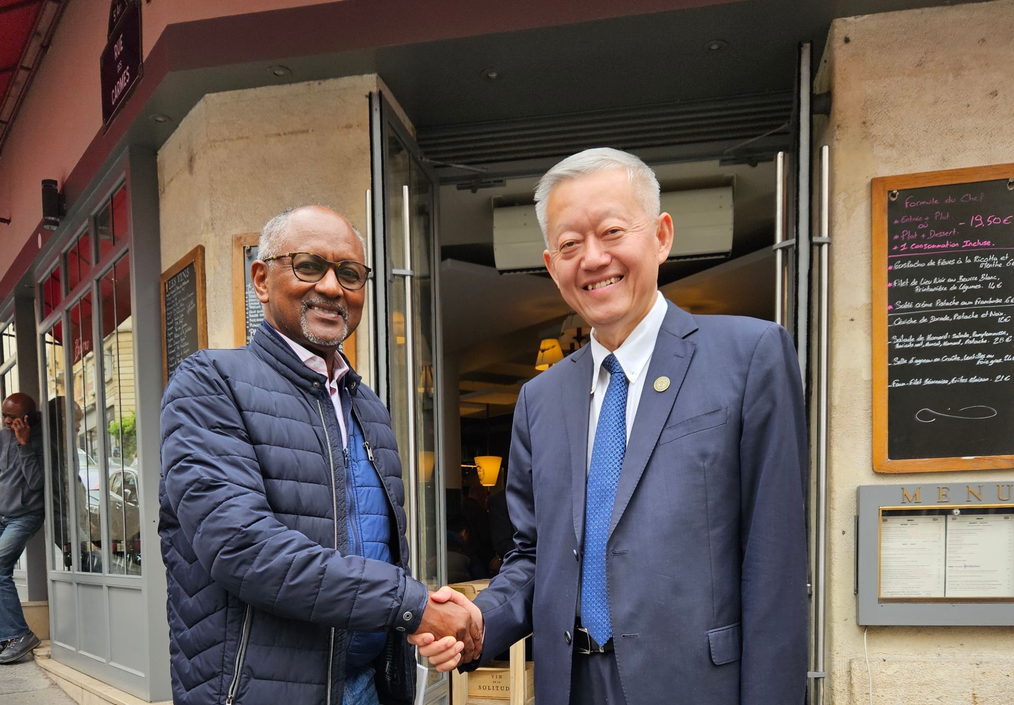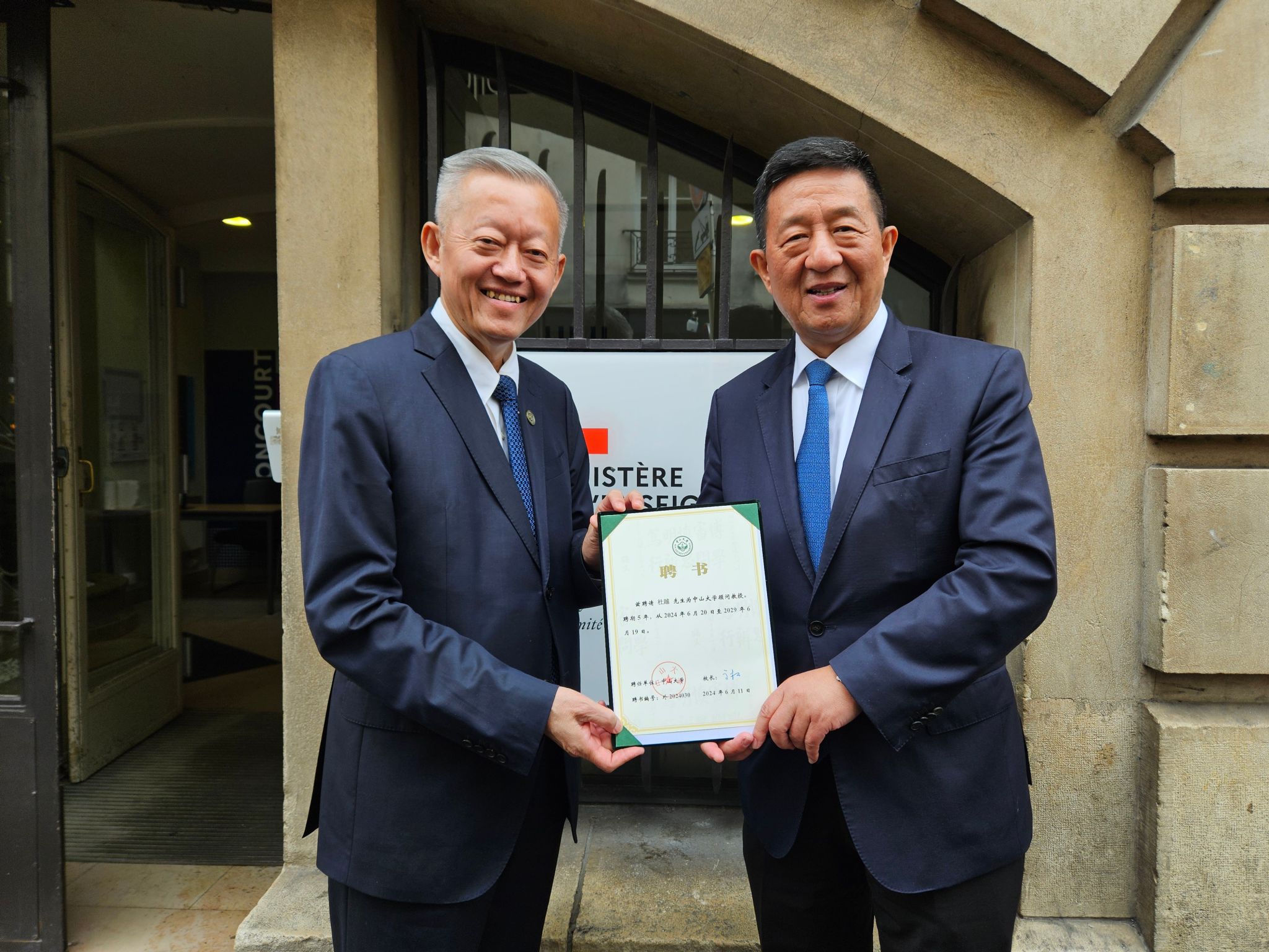 在法国期间,代表团还拜访了联合国教科文组织非洲优先与对外关系助理总干事Firmin Edouard Matoko先生和杜越教授。Matoko先生高度评价了bat365在线中国登录入口的百年发展成就,尤其是长期参与和支持联合国教科文组织的活动,并对bat365在线中国登录入口百年校庆表示祝贺。双方达成共识,将进一步发掘合作潜力,建立更加紧密的合作伙伴关系。在国际语言人才服务、文化遗产保护和旅游管理、海洋研究等领域加强合作。双方就国际组织人才培养、中非教育合作等面临的挑战交换了意见。杜越教授服务于联合国教科文组织超过四十年,为深化中国与教科文组织的合作做出了巨大的贡献,得到了国际和国内各方面高度认可。陈春声书记为杜越教授颁发了bat365在线中国登录入口顾问教授聘书,希望借鉴杜越教授丰富的国际组织多边外交经验,推动中大的国际组织人才培养、加强各相关学科与联合国系统的合作伙伴关系。