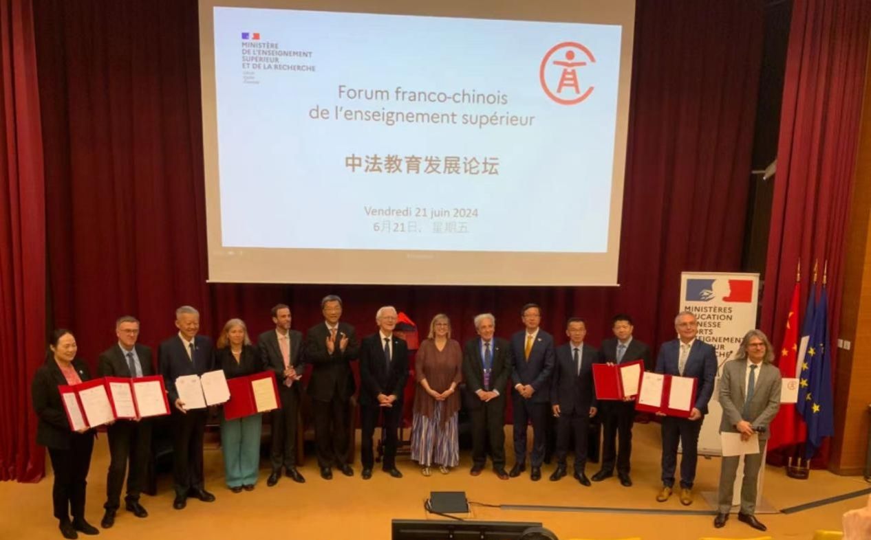 中法两国教育部部长与在本次论坛签署协议的三所高校代表在大会论坛上合影