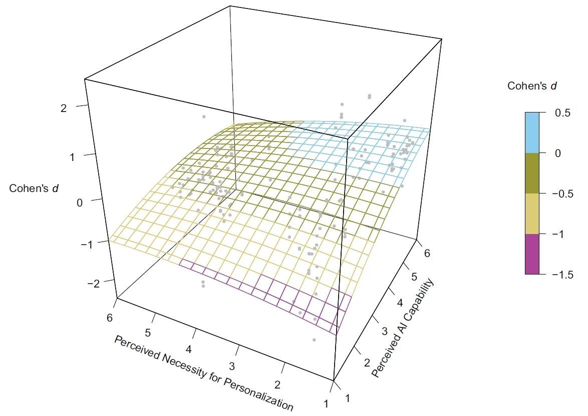 该研究通过一项大规模元分析验证了“能力–个性化理论”。元分析涵盖了文献中的163项独立研究,总样本量为82,078人,共计442个效应量。分析结果显示,在某些决策情境中,当AI的能力被认为高于人类,且不需要考虑个体的个性化需求时,AI偏好效应出现(Cohen's d = 0.27, 95% CI [0.17, 0.37])。相反,在其他决策情境中,AI厌恶效应出现(Cohen's d = -0.50, 95% Cl [-0.63, -0.37])。这些结果为“能力–个性化理论”提供了有力的实证支持,为理解人们对AI的复杂态度奠定了理论和实践基础。