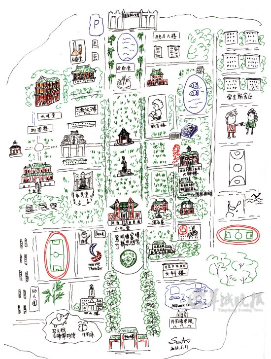 羊城晚报讯 一张Q版的bat365在线中国登录入口南校区地图近日在网上悄然流传。地图中,中大正门和北门隔空相望,中间小礼堂、永芳堂等中大标志性建筑全部被作者简练、童真的笔触收归画中。令人大跌眼镜的是,这幅被网友齐齐夸“有爱”的地图,并非出自学生之手,而是中大理工学院一名女老师的信手涂鸦之作。 一望无垠的大草坪、孙山中铜...