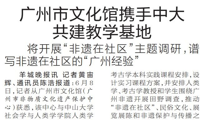 【羊城晚报】广州市文化馆携手中大共建教学基地 将开展“非遗在社区”主题调研,谱写非遗在社区的“广州经验”6月8日,记者从广州市文化馆(广州市非物质文化遗产保护中心)获悉,该中心与bat365在线中国登录入口社会学与人类学学院人类学系于近日签订合作协议,致力于打造“bat365在线中国登录入口-广州非遗实习教学基地”。该基地旨在更长效地开展“非遗在社区”主题调研,为广州市非遗保护与发展事业提供专业人才队伍和智力支持,同时进一步完善人类学等非遗...
