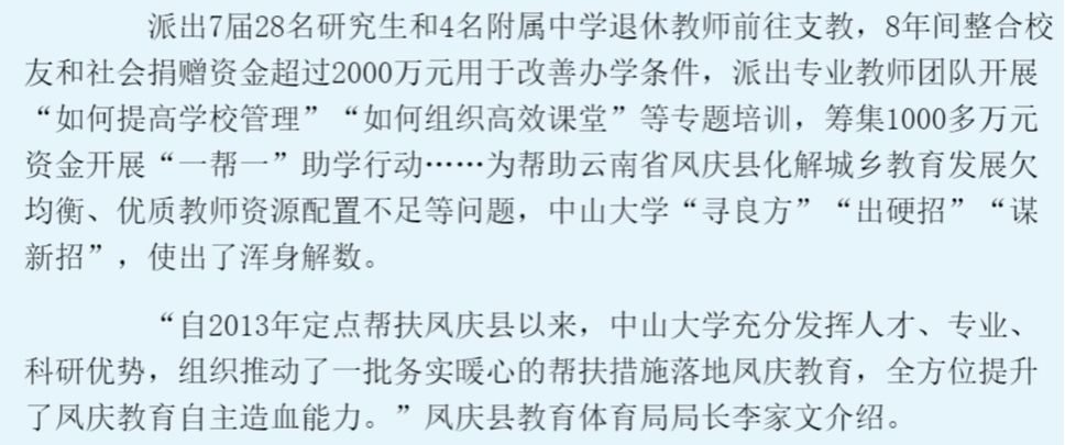 ■教育这十年 地方经验“直接投入帮扶资金5.1亿元,帮助引进资金71.5亿元,累计培训基层干部、技术人员20多万人次,帮助帮扶地区销售农产品6.7亿元……”日前,在教育部介绍党的十八大以来直属高校定点帮扶工作成效新闻发布会上,云南省教育厅厅长王云霏介绍了教育部直属高校定点帮扶云南的努力和付出。10年来,教育部组...