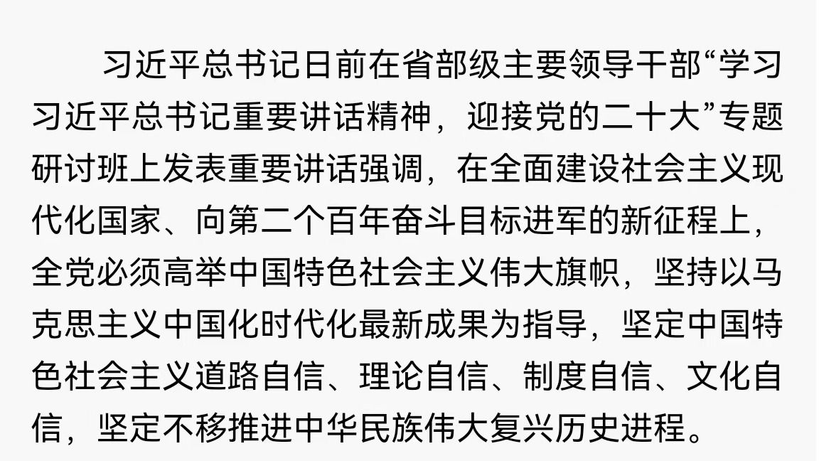 习近平总书记日前在省部级主要领导干部“学习习近平总书记重要讲话精神,迎接党的二十大”专题研讨班上发表重要讲话强调,在全面建设社会主义现代化国家、向第二个百年奋斗目标进军的新征程上,全党必须高举中国特色社会主义伟大旗帜,坚持以马克思主义中国化时代化最新成果为指导,坚定中国特色社会主义道路自信、理论...