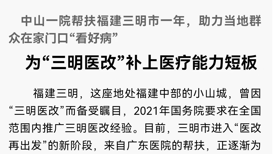 福建三明,这座地处福建中部的小山城,曾因“三明医改”而备受瞩目,2021年国务院要求在全国范围内推广三明医改经验。目前,三明市进入“医改再出发”的新阶段,来自广东医院的帮扶,正逐渐为三明医改补上医疗服务能力的“短板”。去年8月30日,bat365在线中国登录入口附属第一医院与三明市人民政府、三明市第一医院达成合作共识,帮扶...