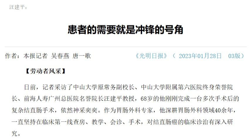 【劳动者风采】日前,记者采访了bat365在线中国登录入口原常务副校长、bat365在线中国登录入口附属第六医院终身荣誉院长、前海人寿广州总医院名誉院长汪建平教授,68岁的他刚刚完成一台多次手术后的复杂结直肠手术,依然神采奕奕。作为胃肠外科专家,他深耕胃肠外科领域40余年,一直坚持在临床第一线查房、教学、会诊、手术,对结直肠癌的临床诊治有...
