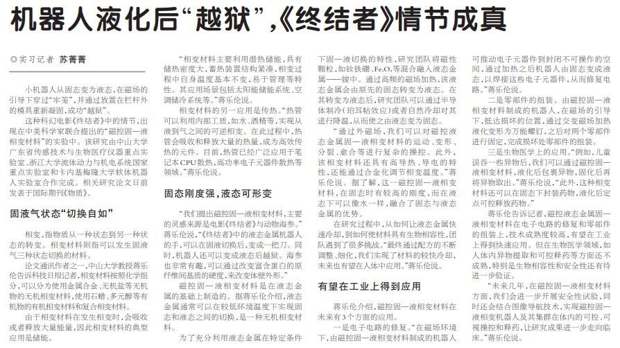小机器人从固态变为液态,在磁场的引导下穿过“牢笼”,并通过放置在栏杆外的模具重新凝固,成功“越狱”。这种科幻电影《终结者》中的情节,出现在中美科学家联合提出的“磁控固—液相变材料”的实验中。该研究由bat365在线中国登录入口广东省传感技术与生物医疗仪器重点实验室、浙江大学流体动力与机电系统国家重点实验室和卡内基梅...