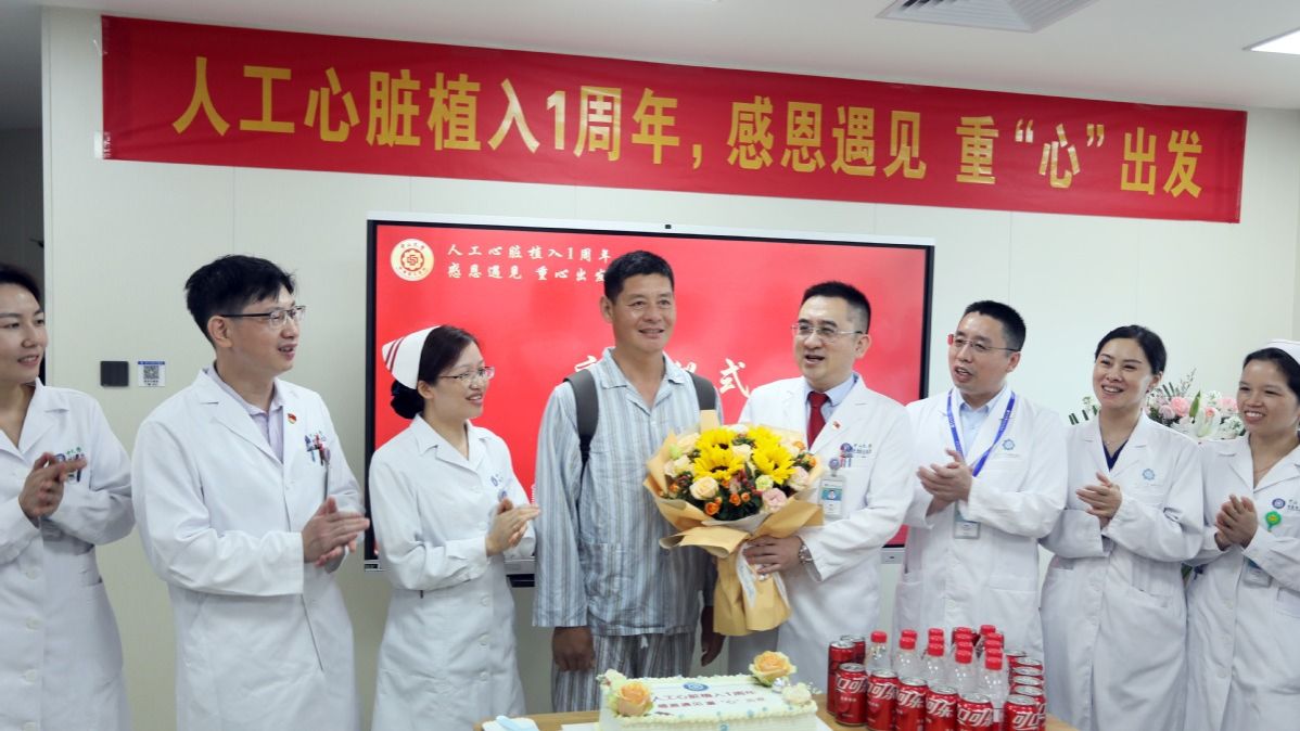 祝你生日快乐……”5月4日上午,中大五院心血管病中心举办了一场特殊的生日会,这正是心衰患者邓先生植入人工心脏一周年的日子,在他返院复查之际,中大五院心血管病中心医护人员陪他一起吹蜡烛、吃蛋糕,度过了难忘的“一岁”生日。
