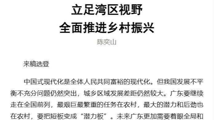 中国式现代化是全体人民共同富裕的现代化。但我国发展不平衡不充分问题仍然突出,城乡区域发展差距仍然较大。广东要继续走在全国前列,最艰巨最繁重的任务在农村,最大的潜力和后劲也在农村,要把短板变成“潜力板”。未来广东更加需要着眼全局和战略长远,在坚定不移推动高质量发展的基础上,统筹协调乡村振兴和粤港澳...