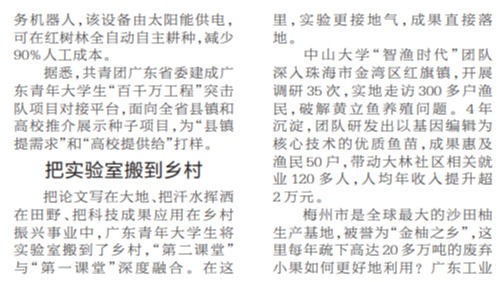 为推动主题教育走深走实,共青团广东省委发挥组织优势,动员全省161所高校,从岭南特色农业、海洋经济产业、特色制造业、文化创意、休闲旅游等方面挖掘大学生可为能为的关键领域、关键环节,形成首批100个大学生团队助力高质量发展的优秀示范种子项目。日前,广东青年大学生“百千万工程”突击队行动签约仪式举行,中山...