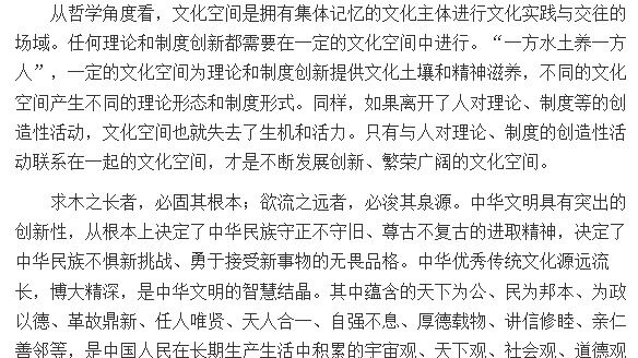 中华优秀传统文化为我们探索面向未来的理论和制度创新开拓了更广阔的文化空间,我们党在传承和发展中华优秀传统文化中推进理论和制度创新的自觉性也达到了新高度。