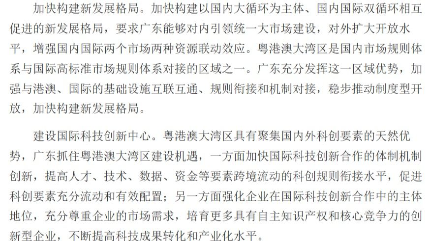 粤港澳大湾区在全国新发展格局中具有重要战略地位。广东认真贯彻党中央决策部署,把粤港澳大湾区建设作为广东深化改革开放的大机遇、大文章抓紧做实,摆在重中之重的位置,以珠三角为主阵地,举全省之力办好这件大事,推动粤港澳大湾区成为新发展格局的战略支点、高质量发展的示范地、中国式现代化的引领地。