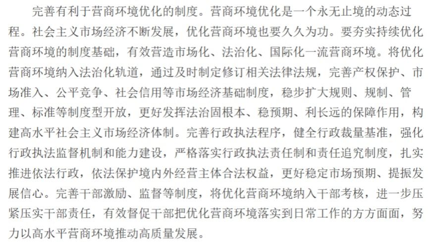 优化营商环境是全面深化改革、实现高质量发展的必然选择,也是推进国家治理体系和治理能力现代化的重要任务。习近平总书记强调:“要继续深化改革,坚持‘两个毫不动摇’,优化营商环境。”营商环境没有最好,只有更好。持续优化营商环境是一项系统工程,涉及宏观调控、市场监管、公共服务等多领域、多层次的制度安排,...