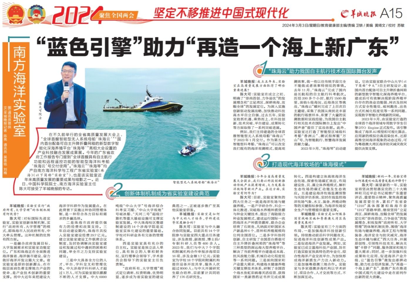 在不久前举行的全省高质量发展大会上,“全球首艘智能型无人系统母船‘珠海云’”“国内首台配备可自主升降折叠网箱的新型数字智能化深海养殖平台‘珠海琴’”亮相大会设置的产业科技融合发展成果展。今年的广东省政府工作报告专门提到“全球首艘具有自主航行功能和远程遥控功能的智能型海洋科考船‘珠海云’号交付使用...