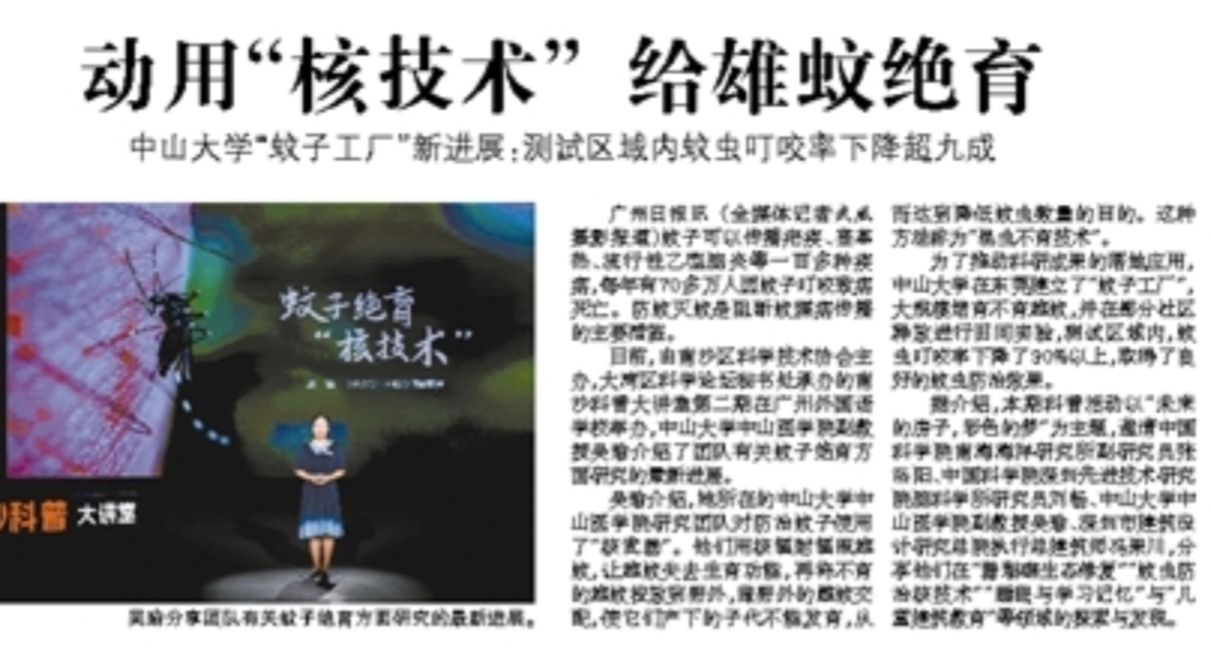 蚊子可以传播疟疾、登革热、流行性乙型脑炎等一百多种疾病,每年有70多万人因蚊子叮咬致病死亡。防蚊灭蚊是阻断蚊媒病传播的主要措施。日前,由南沙区科学技术协会主办,大湾区科学论坛秘书处承办的南沙科普大讲堂第二期在广州外国语学校举办,bat365在线中国登录入口中山医学院副教授吴瑜介绍了团队有关蚊子绝育方面研究的最新进展。...