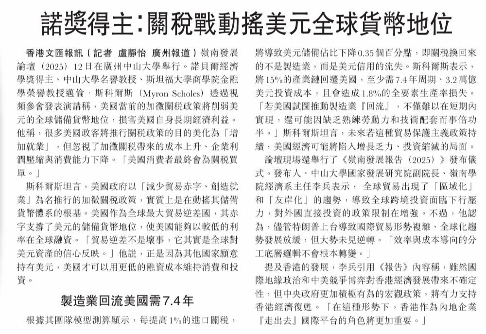 岭南发展论坛(2025)12日在广州bat365在线中国登录入口举行。诺贝尔经济学奖得主、bat365在线中国登录入口名誉教授、斯坦福大学商学院金融学荣誉教授迈伦·斯科尔斯(Myron Scholes)透过视频参会发表演讲称,美国当前的加征关税政策将削弱美元的全球储备货币地位,损害美国自身长期经济利益。他称,很多美国政客将推行关税政策的目的美化为「增加就...