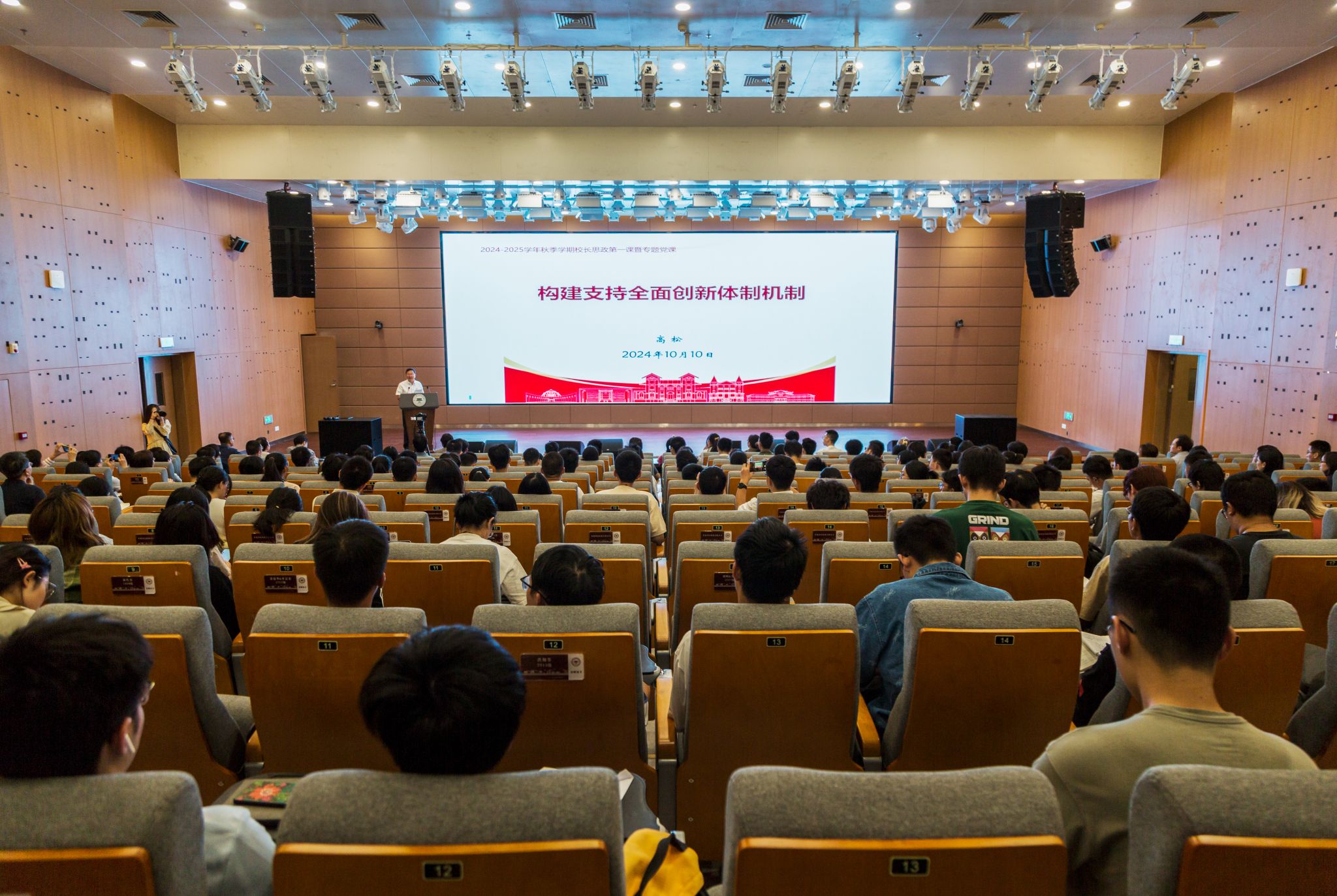 中大新闻网讯(记者刘俊鹏 徐璐 摄影王晨歆 王钟曦)为深入学习贯彻党的二十届三中全会精神,10月10日,校长高松院士在广州校区南校园生命科学学院讲学厅以“构建支持全面创新体制机制”为主题,为学校师生讲授2024年秋季学期“思政第一课”暨党的二十届三中全会精神宣讲专题党课。来自各院系的学生代表,机关各党支部书记,以及机关青年党员专题读书班学员近300人在现场同听这堂党课。校党委副书记国亚萍主持课程。授课现场高...