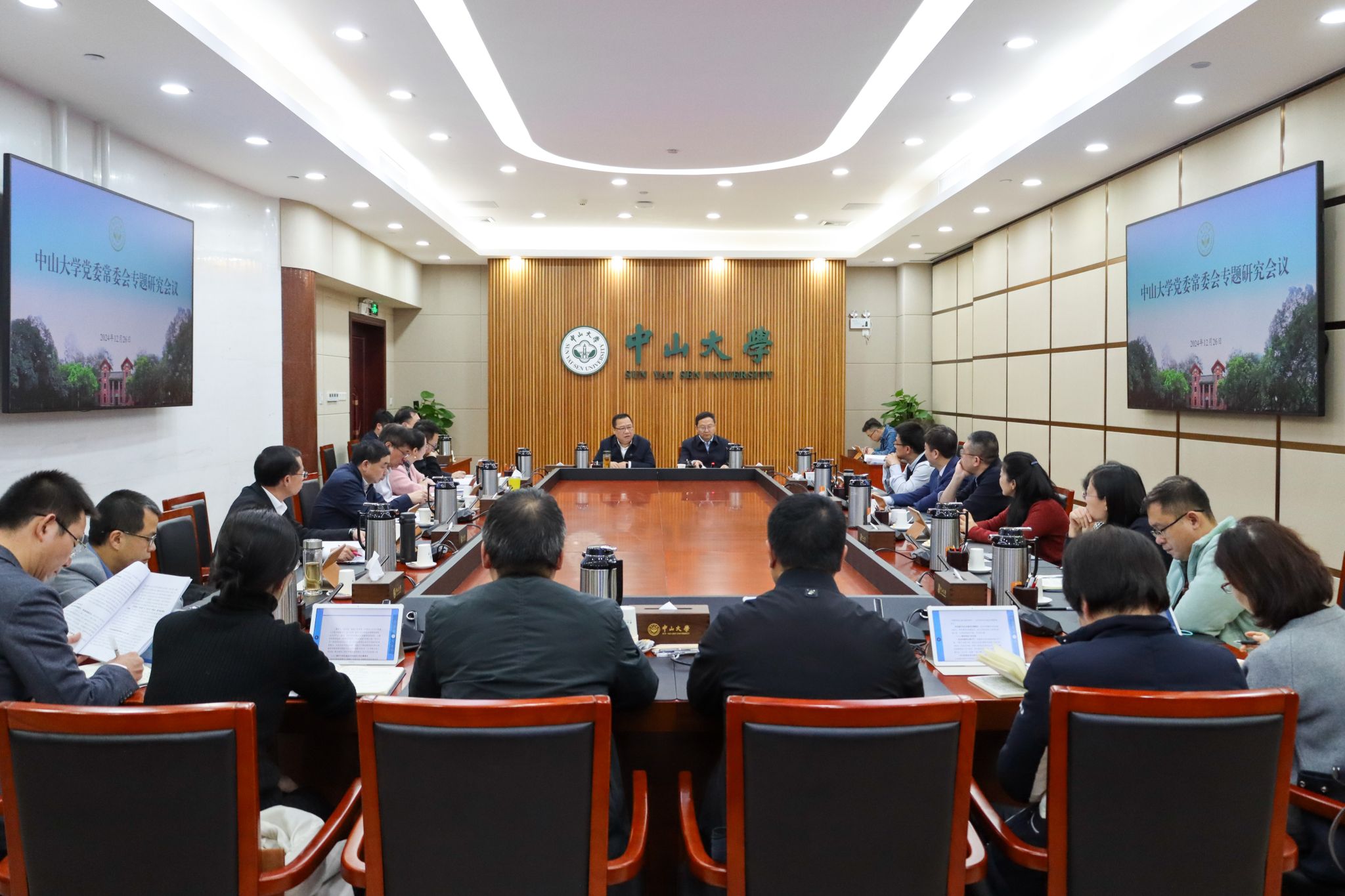 中大新闻网讯(记者张妍)2024年12月26日,我校党委常委会在广州校区南校园中山楼召开会议,专题研究思想政治建设及基层党建等工作。会议由校党委书记朱孔军主持。全体在校党委常委参加会议,其他校领导班子成员、相关院系和职能部门负责人列席会议。会议现场(党委宣传部 林玮琪摄)朱孔军书记传达了上级有关会议和文件精神。王帆副书记汇报了思想政治工作方面的情况。他指出,学校不断完善“大思政”格局,通过加强理论武装、...
